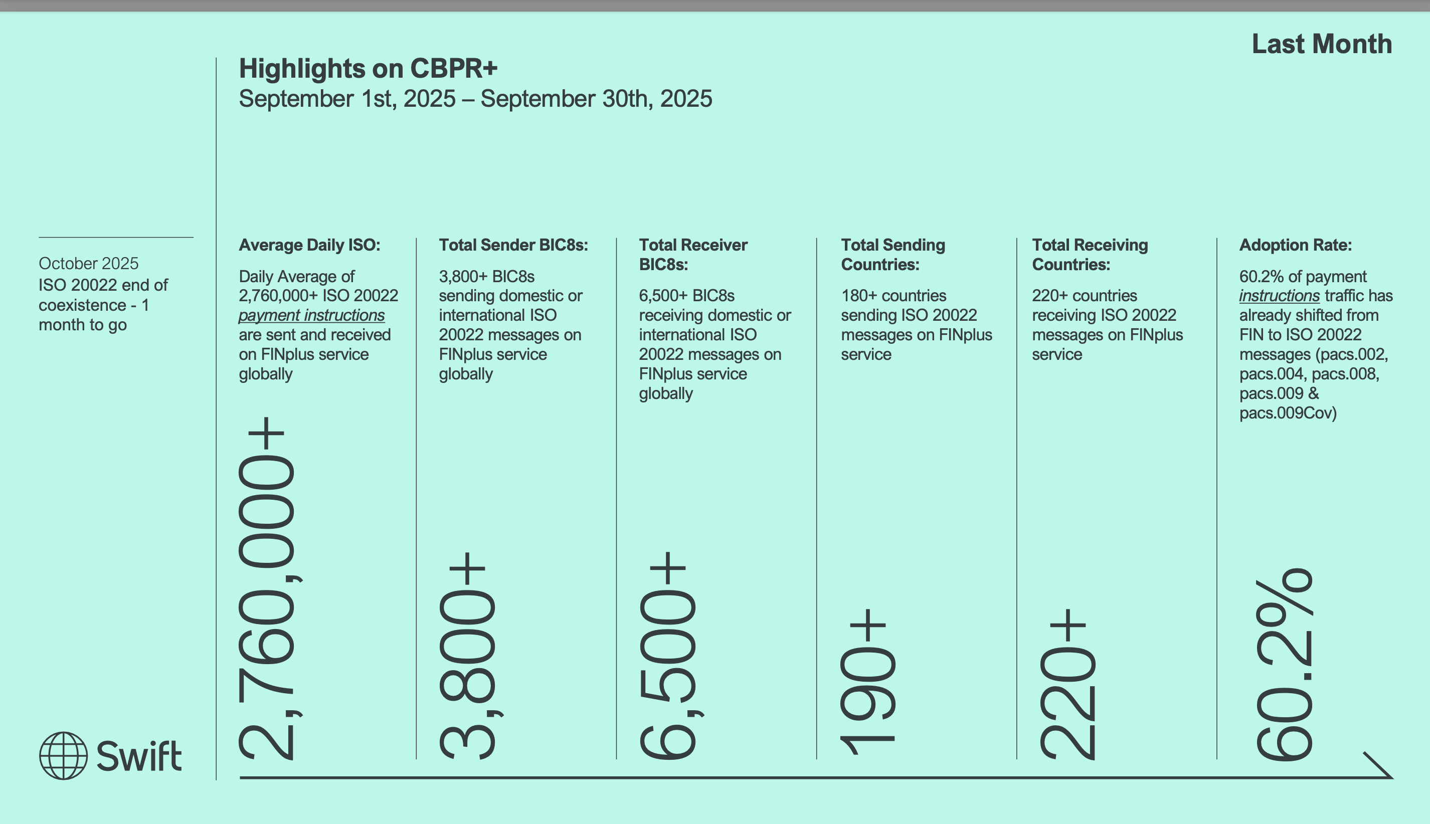 As of September 2025, approximately 60.2% of the payment instructions traffic on the SWIFT network had transitioned from FIN to native ISO 20022, reflecting a substantial increase from the 41.2% recorded in May 2025. While adoption has accelerated significantly in the final phase of free coexistence, this progress also highlights the scale and complexity of the remaining migration efforts still required across the industry.